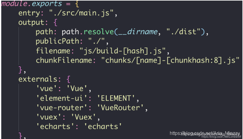 externals: {'vue': 'Vue','vue-router': 'VueRouter','element-ui': 'ELEMENT',"echarts": "echarts",},