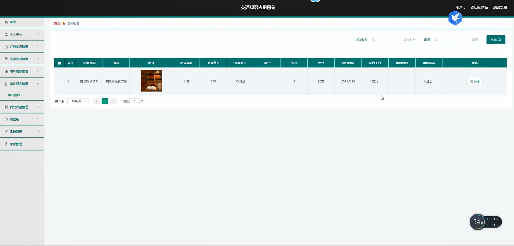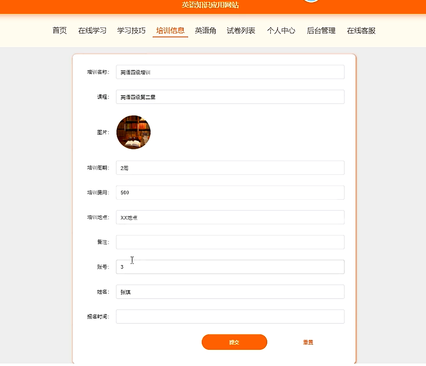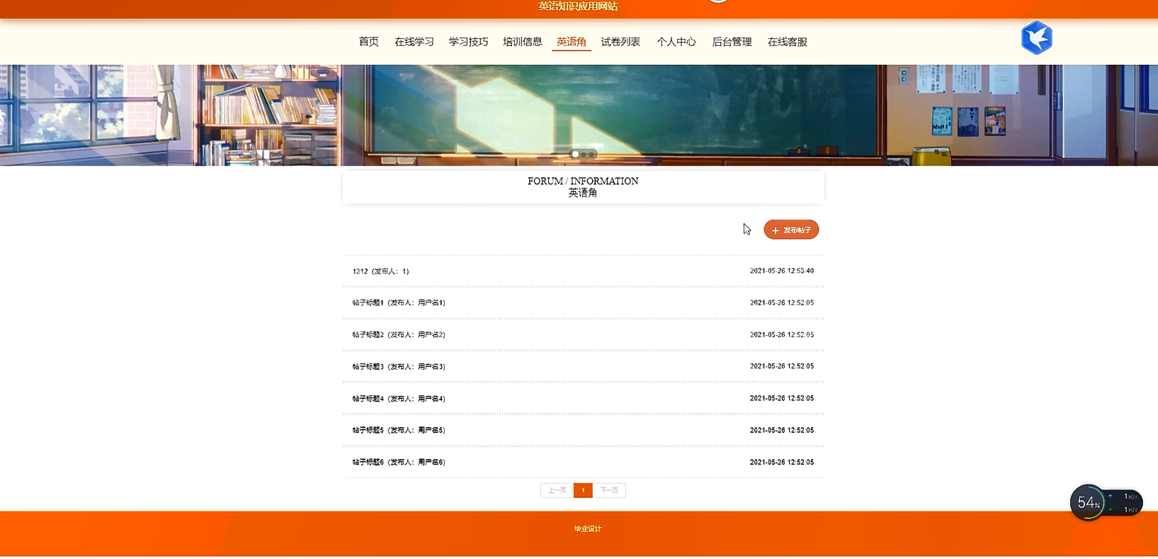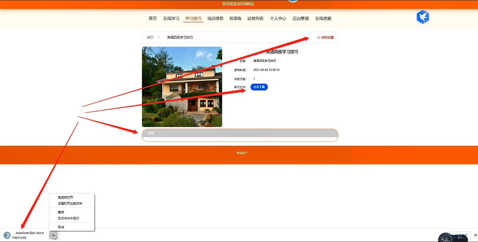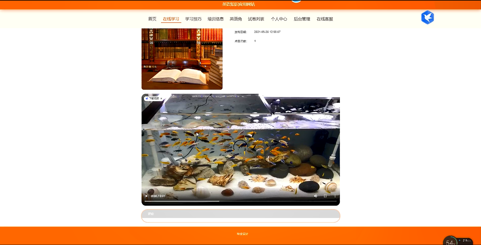 用户端功能有:在线学习、学习技巧、培训信息、英语角、在线考试、在线客服等功能