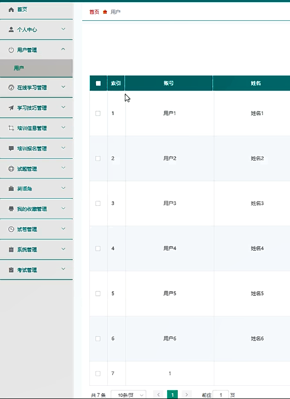 管理端功能有:用户管理、在线学习管理、学习技巧管理、培训信息管理、培训报名管理、试题管理、英语角管理、收藏管理、试卷管理、系统管理、考试管理等