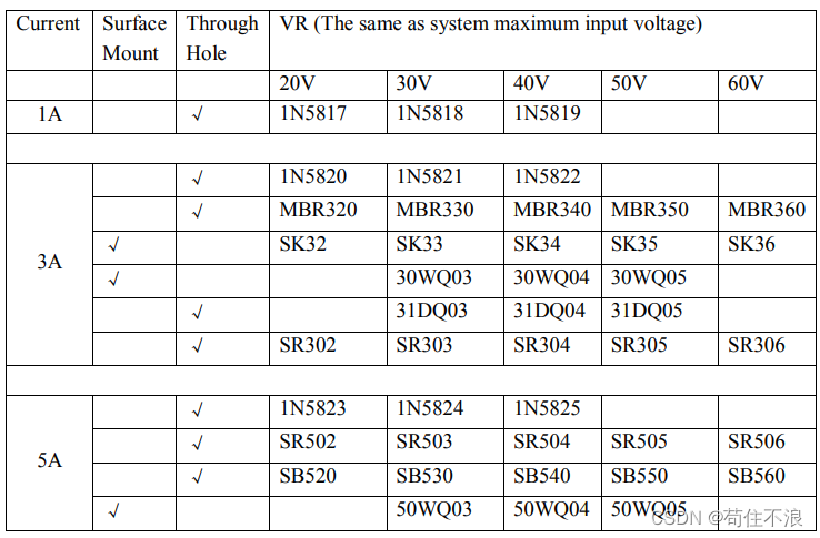 七、不同电流、电压时,肖特基二极管推荐使用型号