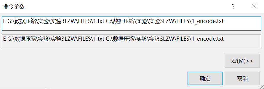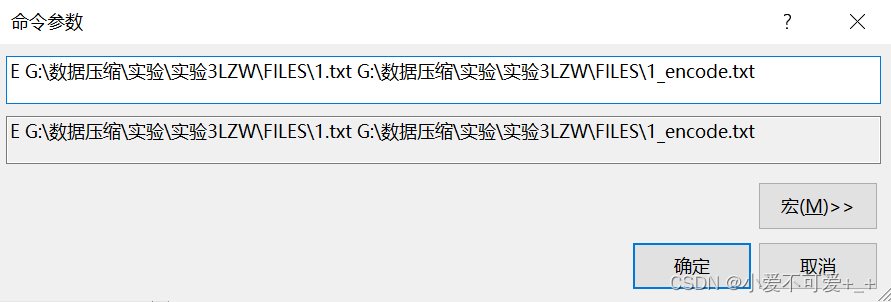 int main( int argc, char **argv){FILE *fp;BITFILE *bf;/*传参格式:argv[1]:D或E表示解码或编码argv[2]:输入文件的路径及名称argv[3]:输出文件的路径及名称*/if( 4>argc){fprintf( stdout, "usage: \n%s \n", argv[0]);fprintf( stdout, "\t: E or D reffers encode or decode\n");fprintf( stdout, "\t: input file name\n");fprintf( stdout, "\t: output file name\n");return -1;}if( 'E' == argv[1][0]){ // do encodingfp = fopen( argv[2], "rb");bf = OpenBitFileOutput( argv[3]);if( NULL!=fp && NULL!=bf){LZWEncode( fp, bf);fclose( fp);CloseBitFileOutput( bf);fprintf( stdout, "encoding done\n");}printf("Encode dictionary:\n");PrintDictionary();}else if( 'D' == argv[1][0]){ // do decodingbf = OpenBitFileInput( argv[2]);fp = fopen( argv[3], "wb");if( NULL!=fp && NULL!=bf){LZWDecode( bf, fp);fclose( fp);CloseBitFileInput( bf);fprintf( stdout, "decoding done\n");}printf("Decode dictionary:\n");PrintDictionary();}else{ // otherwisefprintf( stderr, "not supported operation\n");}return 0;