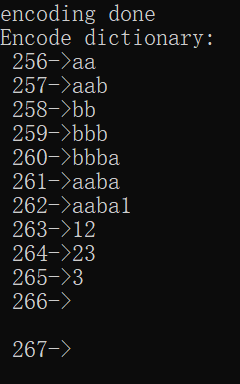 void LZWEncode( FILE *fp, BITFILE *bf){int character;int string_code;int index;unsigned long file_length;fseek( fp, 0, SEEK_END);file_length = ftell( fp);fseek( fp, 0, SEEK_SET);BitsOutput( bf, file_length, 4*8);InitDictionary();string_code = -1;while( EOF!=(character=fgetc( fp))){index = InDictionary( character, string_code);if( 0<=index){ // string+character in dictionarystring_code = index;}else{ // string+character not in dictionaryoutput( bf, string_code);if( MAX_CODE > next_code){ // free space in dictionary// add string+character to dictionaryAddToDictionary( character, string_code);}string_code = character;}}output( bf, string_code);
