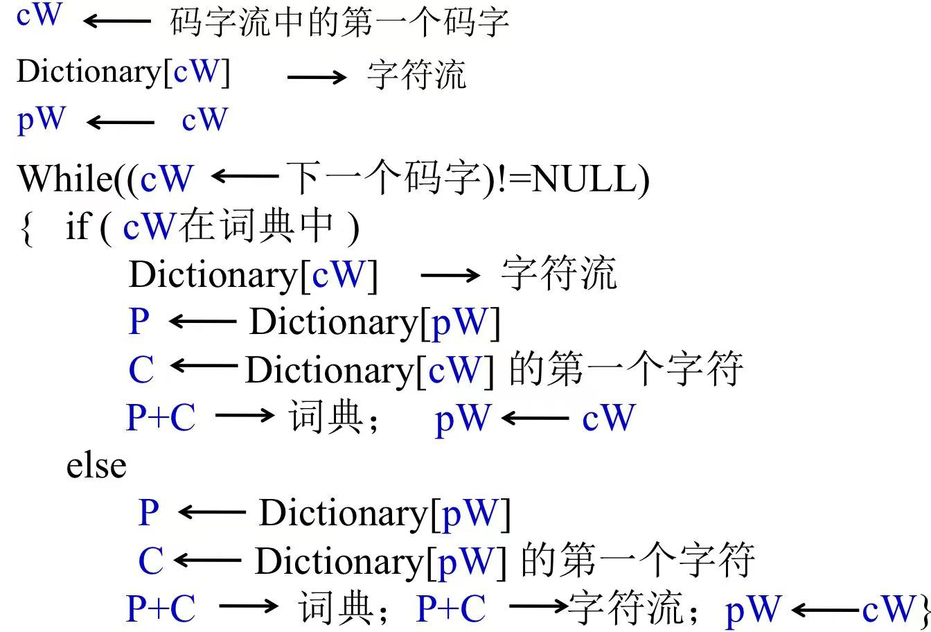 步骤 1 :在开始译码时词典包含所有可能的前缀根。 步骤 2 :令 CW : = 码字流中的第一个码字。 步骤 3 :输出当前缀 - 符串 string.CW 到码字流。 步骤 4 :先前码字 PW : = 当前码字 CW 。 步骤 5 :当前码字 CW : = 码字流的下一个码字。 步骤 6 :判断当前缀 - 符串 string.CW是否在词典中。(1)如果 ” 是 ” ,则把当前缀 - 符串 string.CW 输出到字符流。 当前前缀P = 先前缀 - 符串 string.PW 。 当前字符C = 当前前缀 - 符串 string.CW 的第一个字符。 把 缀-符串P+C 添加到词典。 (2)如果 ” 否 ” ,则当前前缀 P : = 先前缀 - 符串 string.PW 。 当前字符C:= 当前缀 - 符串 string.CW 的第一个字符。 输出缀-符串P+C 到字符流 , 然后把它添加到词典中。 步骤7:判断码字流中是否还有码字要译。 (1 )如果 ” 是 ” ,就返回步骤 4 。 (2)如果 ” 否 ”,结束 该算法首先初始化词典,然后顺序从压缩文件中读入码字并按照上述步骤执行解码,最后将解得的字符串输出至文件中,可用以下伪代码段表示: