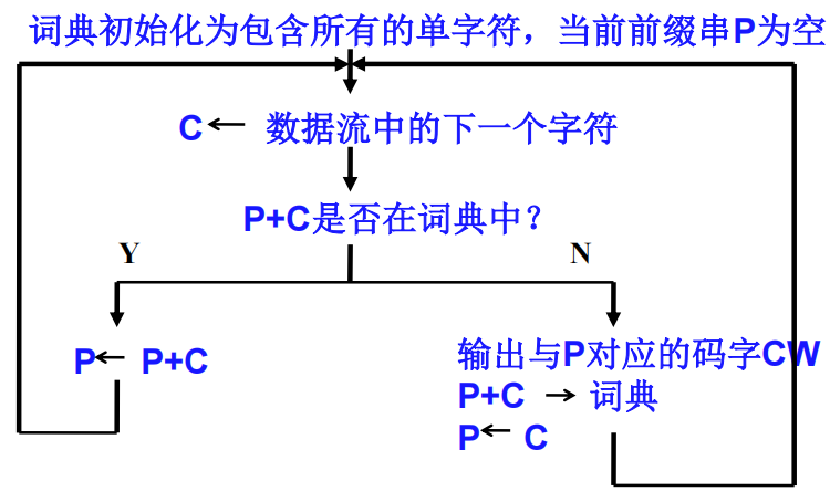 步骤 1 :将词典初始化为包含所有可能的单字符,当前前缀 P 初始化为空。 步骤 2 :当前字符 C= 字符流中的下一个字符。 步骤 3 :判断 P + C 是否在词典中 (1 )如果 “ 是 ” ,则用 C 扩展 P ,即让 P=P + C ,返回到步骤 2 。 (2)如果 “ 否 ” ,则 输出与当前前缀P相对应的码字 W ; 将P+ C 添加到词典中; 令P=C,并返回到步骤 2 该算法首先初始化词典,然后顺序从待压缩文件中读入字符并按照上述步骤执行编码,最后将编得的码字流输出至文件中,可用以下流程图表示: