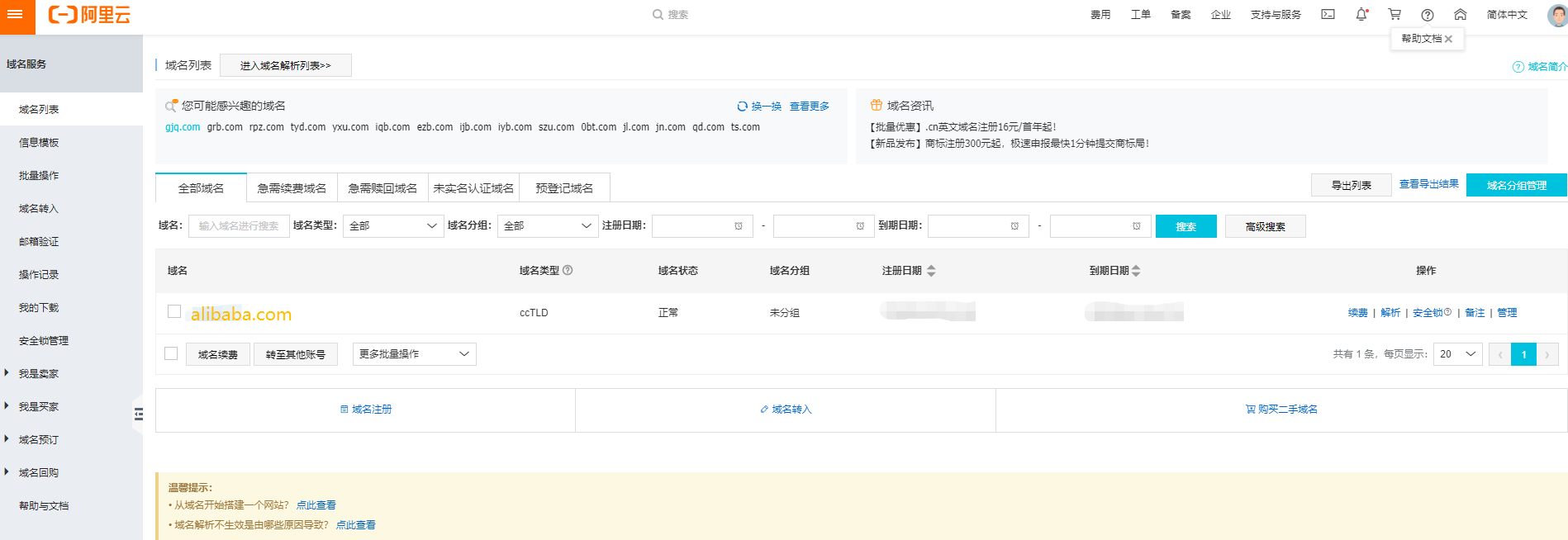 一:若想要使用该域名(例如:alibaba.com),需要进行一下步骤: