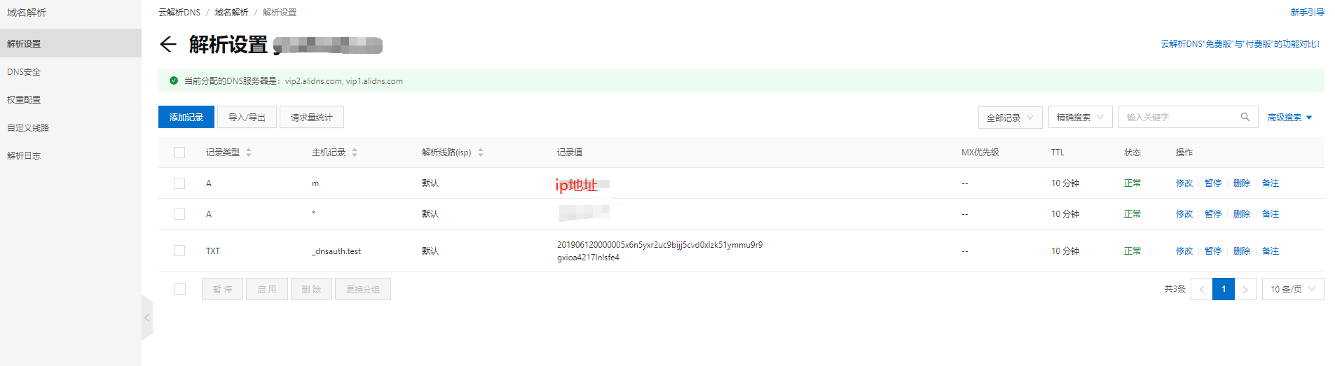 修改成功后,配置域名指向的IP地址,结果可以看到如下信息: