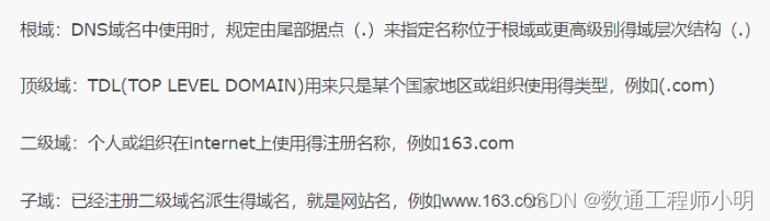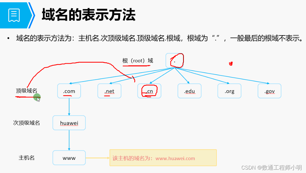 域名表示方法:根域、顶级域名、次顶级域名、主机名