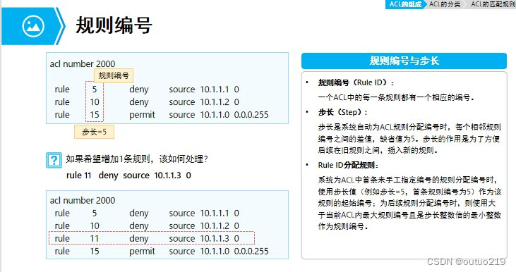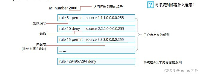 CL由若干条permit或deny语句组成。每条语句就是该ACL的一条规则,每条语句中的permit或deny就是与这条规则相对应的处理动作。