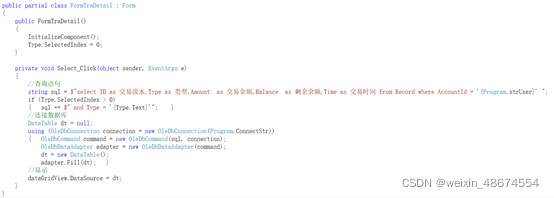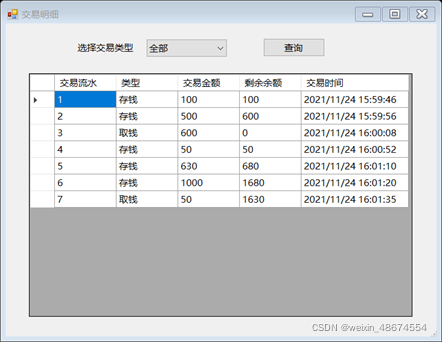 用户成功登录后,可在主界面点选交易明细按钮,进入交易明细窗口。进入窗口后,可根据需要选择要查询的交易类型,有“全部”、“取钱”和“存钱”三种选项,用户选定交易类型后可点击查询,界面中的dataGridView窗口即显示检索结果,实现交易明细查询的功能。