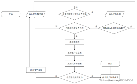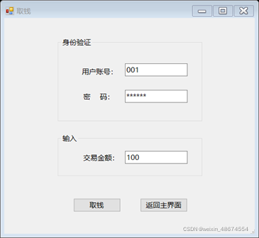 取钱:用户成功登录后,点选进入取钱界面,需要重新输入正确的账号和密码以进行身份核验,并输入想要取走的金钱数额。点击取钱按钮后,系统会先检测账号的正确性,再检测密码的正确性,两者均正确才能完成取钱操作。中途若用户不想取了,可以返回主界面,重新选择操作类型或退出系统。