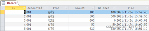 2) 交易明细表:交易明细数据表命名为Record,数据字段有编号(ID)、用户账号(AccountId)、交易类型(Type)、交易金额(Amount)、账户余额(Balance)和交易日期(Time)