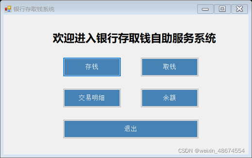 主界面主要起到功能选择和连接各功能模块的作用,上连登录界面,并且既是存钱、取钱、查询明细和查询余额等功能的起点,亦是它们的终点:用户登录后即进入主界面,在主界面点选所需功能即进入各功能区,进行相关操作后,退出功能模块即回到主界面,此时用户可选择进入其他功能模块或退出主界面,即打开指定功能模块或回到最开始时的登录界面。