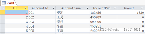 1) 银行账户表:银行账户数据表命名为AcIn,数据表字段有编号(ID)、用户账号(AccountId)、用户姓名(Accountname)、用户密码(AccountPwd)和账户余额(Amount),具体细节如下: