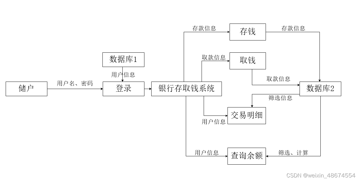 对于银行存取钱系统来言,其主要的用户为储户,隐形用户为银行。因此我们设计的程序需要同时满足储户、银行两方面的需求:对于储户来说,为满足大部分人的使用需求,程序应实现存钱、取钱、查询明细和查询余额等功能;对于银行来言,数据安全是最大的事情,因此我们需要保证系统和储户资金的安全性,即在储户使用本系统时需要进行安全验证。