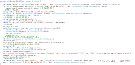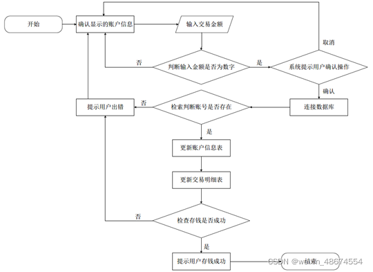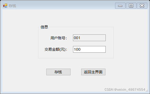 存钱:用户成功登录后,点选进入存钱界面,核对账号是否正确并输入需要存的钱数,点击存钱按钮,系统会弹出确认对话框,用户可核对信息后选择确认或取消。中途用户若不想存了,可以返回主界面,重新选择操作类型或退出系统。