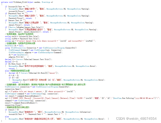 用户成功登录后,可在主界面点选取钱功能,进入取钱窗口。进入窗口后,需要重新输入账号和密码进行身份验证,随后输入取款金额并点击取款,系统会自动检查用户的账号和密码是否正确且对应匹配来进行身份核验。在通过身份验证后,更新该用户账户信息表中的余额数值和交易明细表。若整个过程顺利完成则提示用户取款成功,否则提示错误,取款界面回到最初状态。