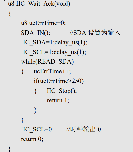 {u8 ucErrTime=0;SDA_IN(); //SDA设置为输入 IIC_SDA=1;delay_us(1); IIC_SCL=1;delay_us(1); while(READ_SDA){ucErrTime++;if(ucErrTime>250){IIC_Stop();return 1;}}IIC_SCL=0;//时钟输出0 return 0;