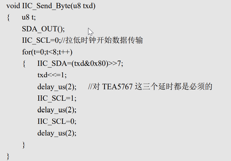 { u8 t; SDA_OUT(); IIC_SCL=0;//拉低时钟开始数据传输for(t=0;t<8;t++){ IIC_SDA=(txd&0x80)>>7;txd<<=1; delay_us(2); //对TEA5767这三个延时都是必须的IIC_SCL=1;delay_us(2); IIC_SCL=0; delay_us(2);}