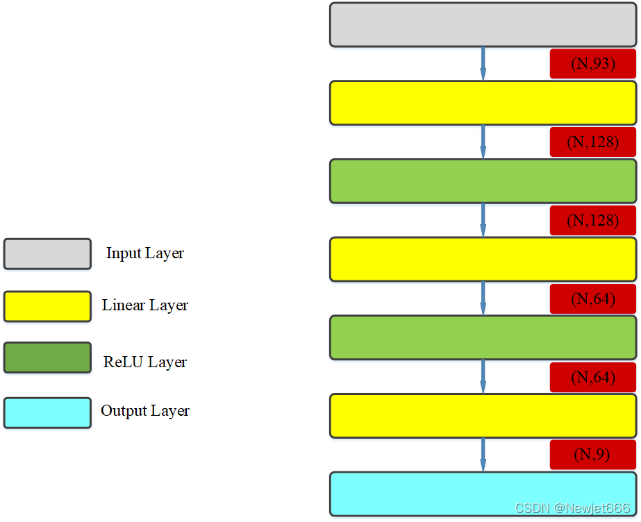 class model(nn.Module):def __init__(self):super(model, self).__init__()self.Linear1 = Linear(93, 128, bias=True)self.Linear2 = Linear(128, 64, bias=True)self.Linear3 = Linear(64, 9, bias=True)self.activate = ReLU()def forward(self, x):x = self.activate(self.Linear1(x))x = self.activate(self.Linear2(x))x = self.Linear3(x)return x# 类实例化