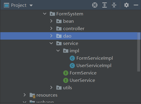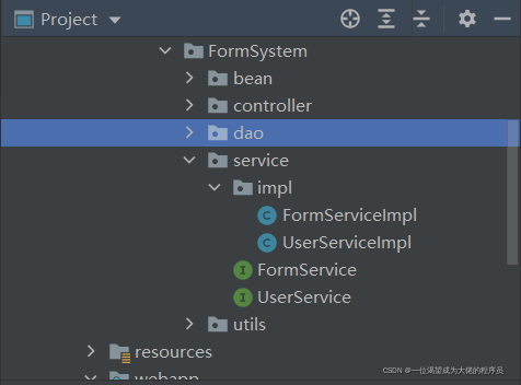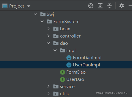 应该尽量面向接口编程,所以我们先新建一个接口,名为UserDao(不必在意那个FormDao)