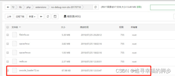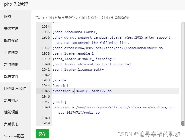 安装php扩展服务:视源码情况,加密需要安装SG11、Swoole扩展服务,开源只需要安装Swoole扩展服务;上传扩展文件swoole_loader72.so ,路径为/www/server/php/72/lib/php/extensions/no-debug-non-zts-20170718