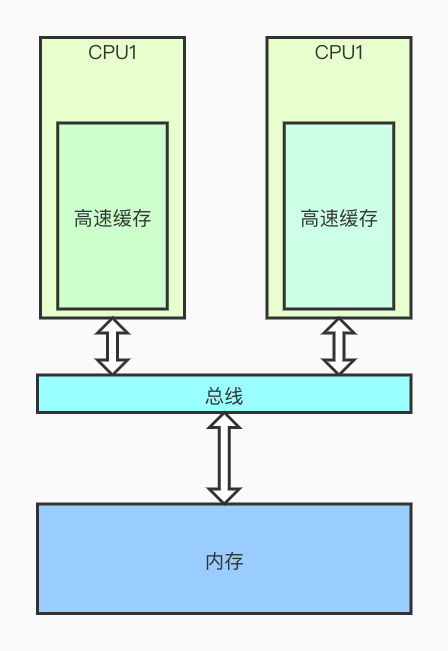 Java内存模型如上图所示,众所周知,CPU的运算速度是远超过内存的读写速度的,估CPU不会直接和内存进行数据交互,而是先将内存中的数据读到高速缓存,CPU缓存是有多级的,如L1,L2,L3等,为说明问题,此处简单看做一级。