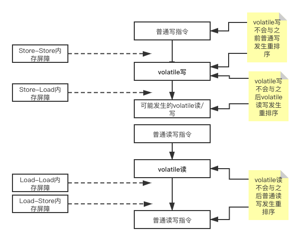 - volatile读与之后的一条语句不能重排序。这个规则确保volatile读之后的操作不会被编译器重排序到volatile读之前。