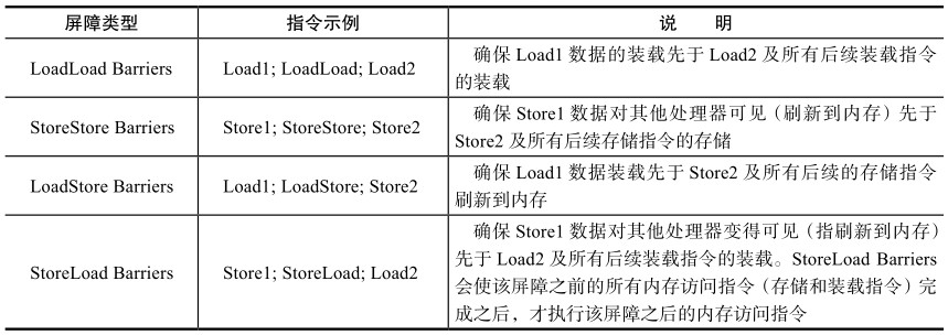 对于处理器重排序,JMM的处理器重排序规则会要求Java编译器在生成指令序列时,插入特定类型的内存屏障(Memory Barriers,Intel称之为Memory Fence)指令,通过内存屏障指令来禁止特定类型的处理器重排序。