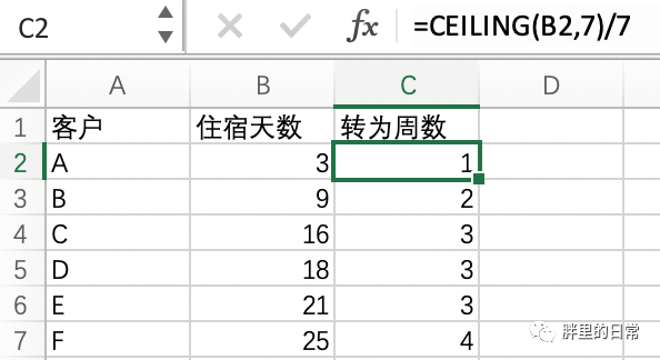 借此出个小题目,有个短租宾馆收费问题,以周为单位收费,如果客户住了9天,需要按2周进行交费,住了16天需要按照3周来交费,如何将大量的客户入住实际天数换算为周数呢?部分参照答案给你,函数自己试试吧。
