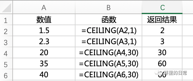 CEILING函数是另一个向上舍入的函数,使用语法为“=CEILING(数值,位数基数)”,意为将“数值”沿绝对值增大的方向上舍入,使得到的结果等于最接近“位数基数”的倍数,还是举个例子吧。