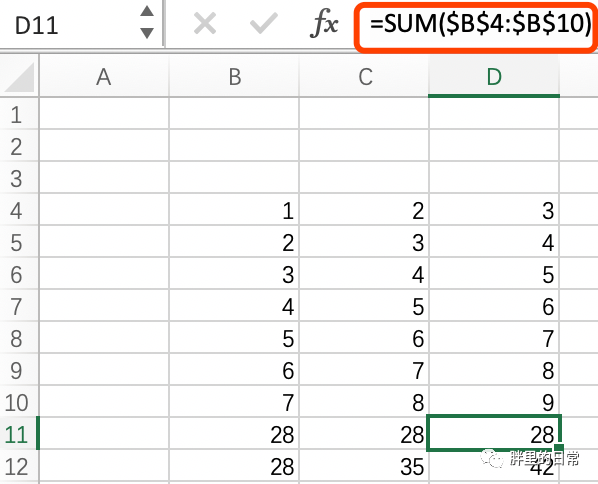 绝对引用就是函数引用的单元或单元格区域的行和列前都加了“$”符,行和列都上锁,这样就能让公式在移动或复制时保持引用的地址不变,示例如下,B11单元格中函数为求B4:B10区域的和,使用绝对引用,函数复制到C11,D11单元格时引用地址仍为B4:B10。