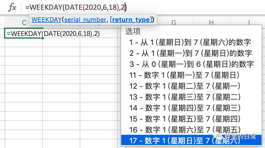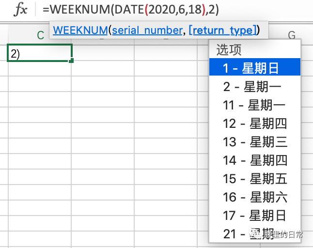 WEEKDAY(日期,return_type)函数用于返回此日期是星期几,其中return_type可取1,2,3。其中1表示返回1-7之间的整数,1为星期日,2为星期一,...,7为星期六;2表示返回1-7之间的整数,1为星期一,2为星期二,...,7为星期日;3表示返回0-6之间的整数,0为星期一,1为星期2,...,6为星期日,可根据具体需要设定return_type(实操发现函数提示中竟然还有更多的选择)。