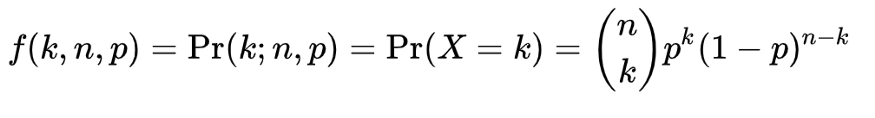 现在假设我们有一个事件成功的概率p,那么失败的概率是(1-p),假设你重复实验n次(试验次数=n)。那么在n个独立的伯努利试验中获得k个成功的概率是: