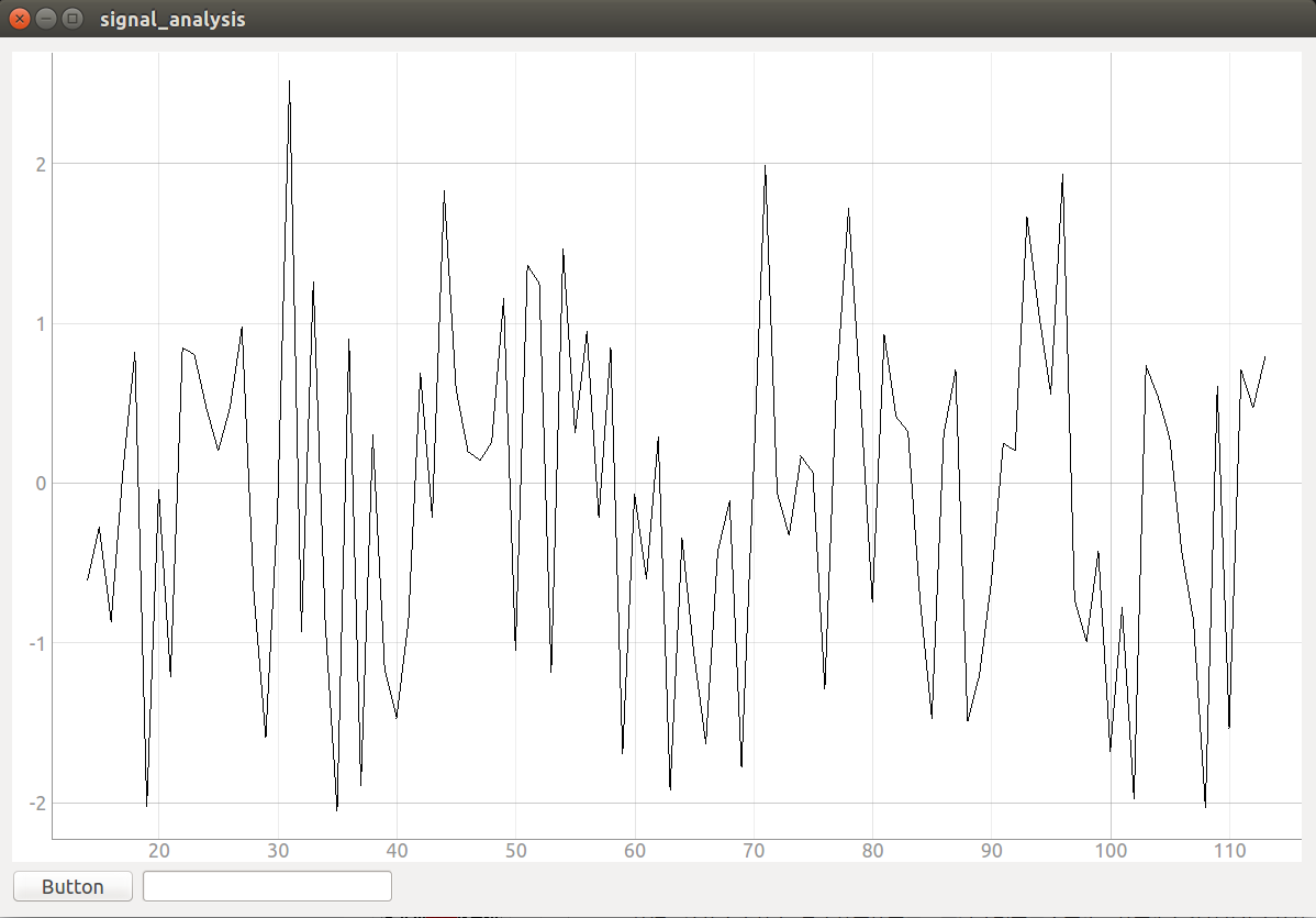 import numpy as npdata = np.random.normal(size=100) # 这里生成一些随机数来画到界面上class Signal(QWidget):ptr1 = 0 # 这是个累加器def __init__(self): super(Signal, self).__init__()self.initUI()def initUI(self):self.setGeometry(0, 0, 1200, 800)self.setWindowTitle('signal_analysis')layout_chart = QtWidgets.QGridLayout()self.setLayout(layout_chart)pg.setConfigOption('background', 'w')self.pw = pg.PlotWidget()self.pw.showGrid(x=True, y=True)self.curve = self.pw.plot(pen='k')layout_chart.addWidget(self.pw, 0, 0, 9, 10)bt1 = QPushButton('Button', self)layout_chart.addWidget(bt1, 10, 0, 1, 1)text1_edit = QLineEdit("", self)layout_chart.addWidget(text1_edit, 10, 1, 1, 2)def draw_signal(self): # 这个函数用来完成画图的工作 data[:-1] = data[1:] # 把data已有的数据放在data数组的最前面data[-1] = np.random.normal() # 在data数组的末尾再添加一个随机数self.ptr1 += 1 # 每添加一个随机数到data中,累加器就+1self.curve.setData(data) # 调用setData(这个模块自带的函数)把要画线的数值给画笔self.curve.setPos(self.ptr1, 0) # 加上这句话,横坐标轴就可以动起来了def main():app = QtWidgets.QApplication(sys.argv)gui = Signal()gui.show()gui.draw_signal() # 调用draw——signal()在绘图空间上画图,这次调用只画最开始生成的100个随机数timer = pg.QtCore.QTimer() # 设一个定时器timer.timeout.connect(gui.draw_signal) # 每次定时器到时间了就调用一次draw_signal(),每次调用都会在data后面再加一个随机数,然后画图timer.start(1000) #refresh time # 定时器刷新时间为1ssys.exit(app.exec_())if __name__ =='__main__':main()
