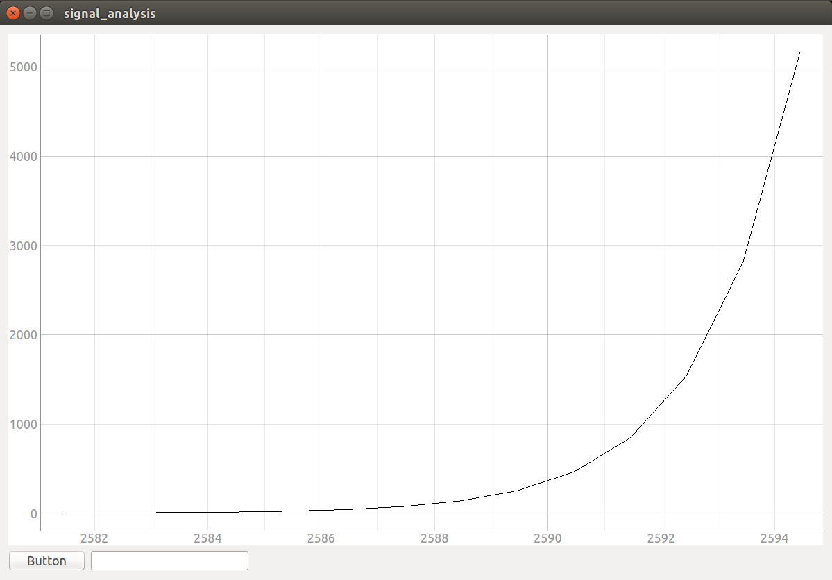 import stringdata = [] # 要画的数据存在这里class Signal(QWidget): # 先写GUI界面ptr1 = 0def __init__(self): super(Signal, self).__init__()self.initUI()def initUI(self):self.setGeometry(0, 0, 1200, 800)self.setWindowTitle('signal_analysis')layout_chart = QtWidgets.QGridLayout()self.setLayout(layout_chart)pg.setConfigOption('background', 'w')self.pw = pg.PlotWidget()self.pw.showGrid(x=True, y=True)self.curve = self.pw.plot(pen='k')layout_chart.addWidget(self.pw, 0, 0, 9, 10)bt1 = QPushButton('Button', self)layout_chart.addWidget(bt1, 10, 0, 1, 1)text1_edit = QLineEdit("", self)layout_chart.addWidget(text1_edit, 10, 1, 1, 2)def draw_signal(self, x, y): data.append(y) # ROS上传来的y值存在data里self.ptr1 = x # ROS上传来的x值赋给ptr1self.curve.setData(data) # 纵坐标self.curve.setPos(self.ptr1, 0) # 横坐标def callback(gps, gui):distance = math.sqrt(math.pow(gps.x, 2)+math.pow(gps.y, 2)) rospy.loginfo('Listener: GPS: x=%f, y=%f, distance=%f', gps.x, gps.y, distance)gui.draw_signal(gps.x, gps.y) # 回调函数里调用draw_signal画图def main():app = QtWidgets.QApplication(sys.argv)gui = Signal() gui.show() rospy.init_node('pylistener', anonymous = True) # ros节点初始化rospy.Subscriber('gps_info', gps, callback, gui) # ros节点接收数据sys.exit(app.exec_())rospy.spin()if __name__ =='__main__':main()