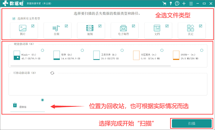 步骤1.打开数据蛙数据恢复专家后(https://www.shujuwa.net/shujuhuifu/),开始操作:文件类型全选是比较全面的(首次体验更是建议全选),文件路径可以是回收站,也可以是文件丢失前的那个存放路径。最后选择好了就可以点击“扫描”啦!