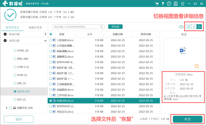 步骤2.通过扫描出来的结果中可以看到左侧就是各种文件类型,当然你可以直接在搜索框内搜索文件名或是类型进行快速查找,切换视图可查看文件详细信息,最后选择好需要恢复的文件确认后点击“恢复”!
