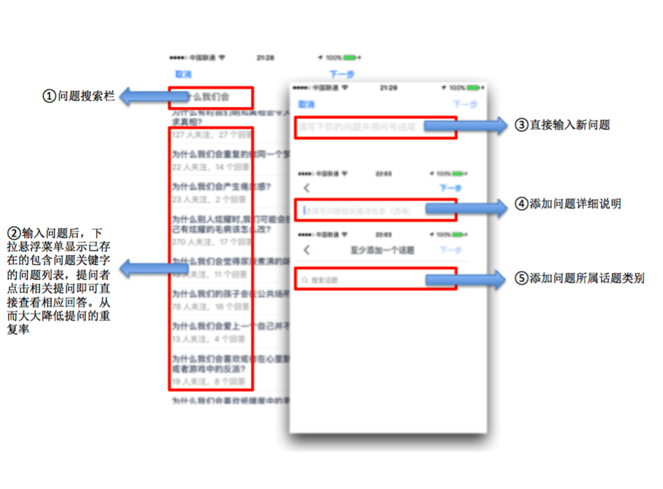 Ⅰ.搜索的已有问题的排列顺序逻辑不清晰。当在“提问栏”输入关键字“为什么我们会”时,包含相同的关键字,受关注度较高的提问并非优先排列,问题之间似乎呈随机分布的状态,这将降低用户的搜索体验。