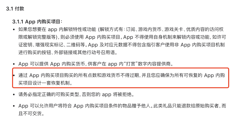 通过 APP 内购买项目购买的所有点数和游戏货币不得过期,并且您应确保为所有可恢复的 APP 内购买项目设计一套恢复机制。