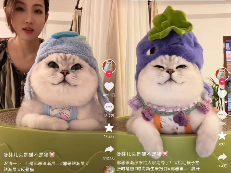 当一只猫与主人“互飙演技”,邪恶的表情与反差感让许多用户在直播间驻足。最近,一只名叫“芬头儿”的银渐层在抖音爆火,并成为了宠物带货主播中的“顶流”。