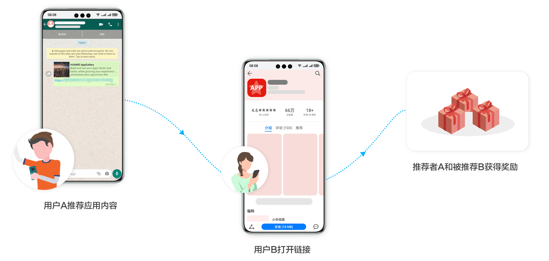 - 社交应用:通过App Linking实现好友邀请功能。用户通过链接或链接生成图片发送邀请,好友点击链接或识别后可以直接跳转到应用内的好友添加页面,简化操作流程。如果好友未安装该社交应用,App Linking会引导其到应用商店下载,安装后仍能跳转到好友添加页面,提升跳转体验。
