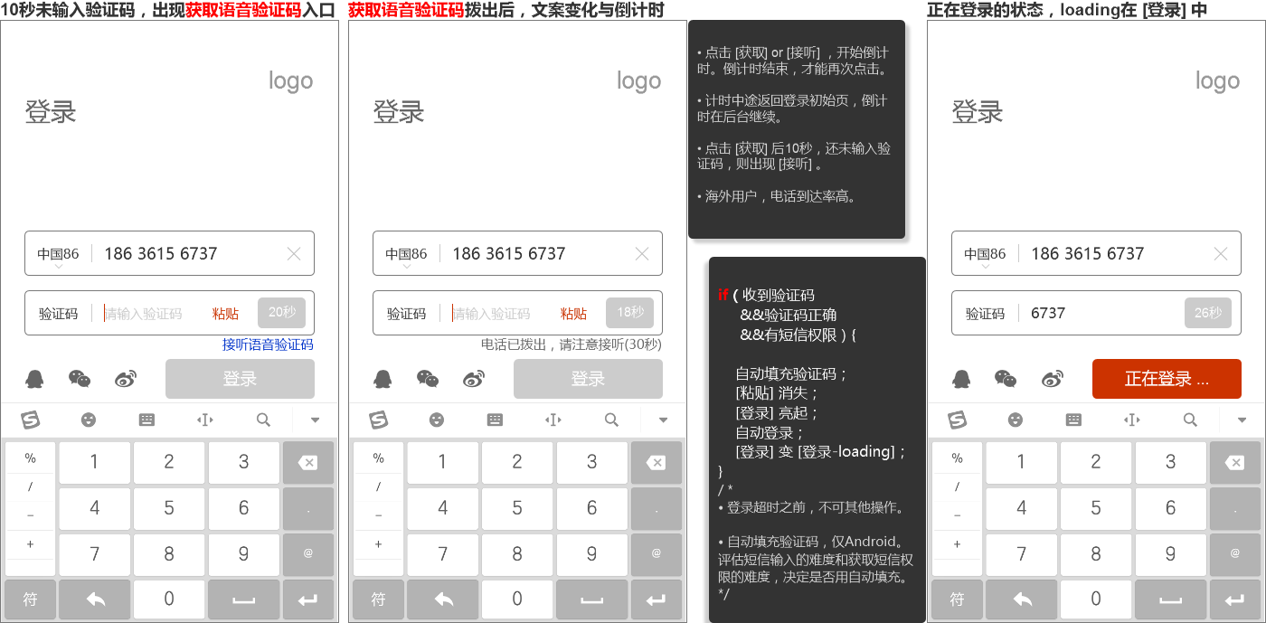 在这个页面,输入框是重点。手机号框,要用很大的字号,并分段显示。验证码框,增加 粘贴 按钮,方便Android用户粘贴。另外,遵循平行备选方案出口原则,在用户输入手机号之后,不隐藏掉第三方登录,只弱化处理。