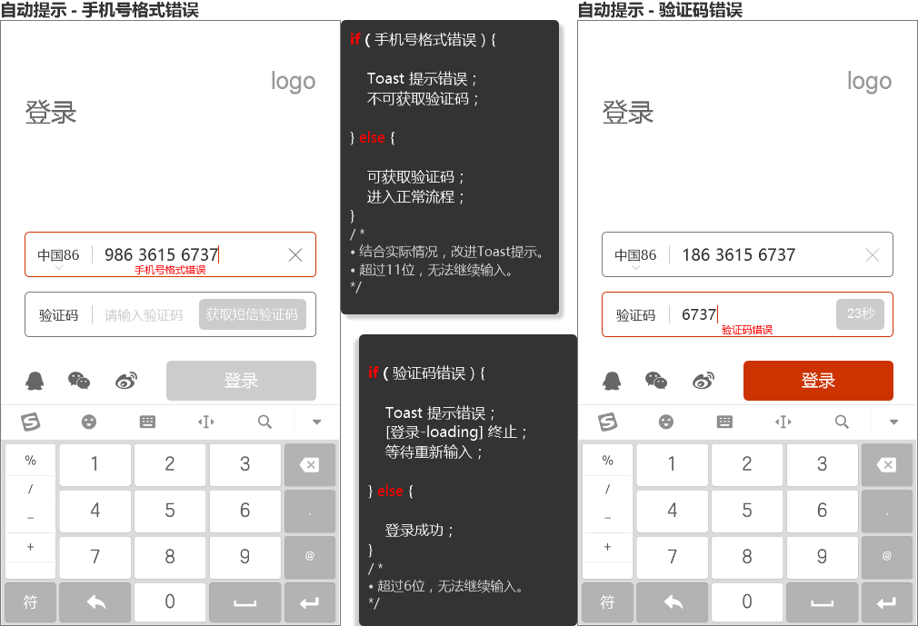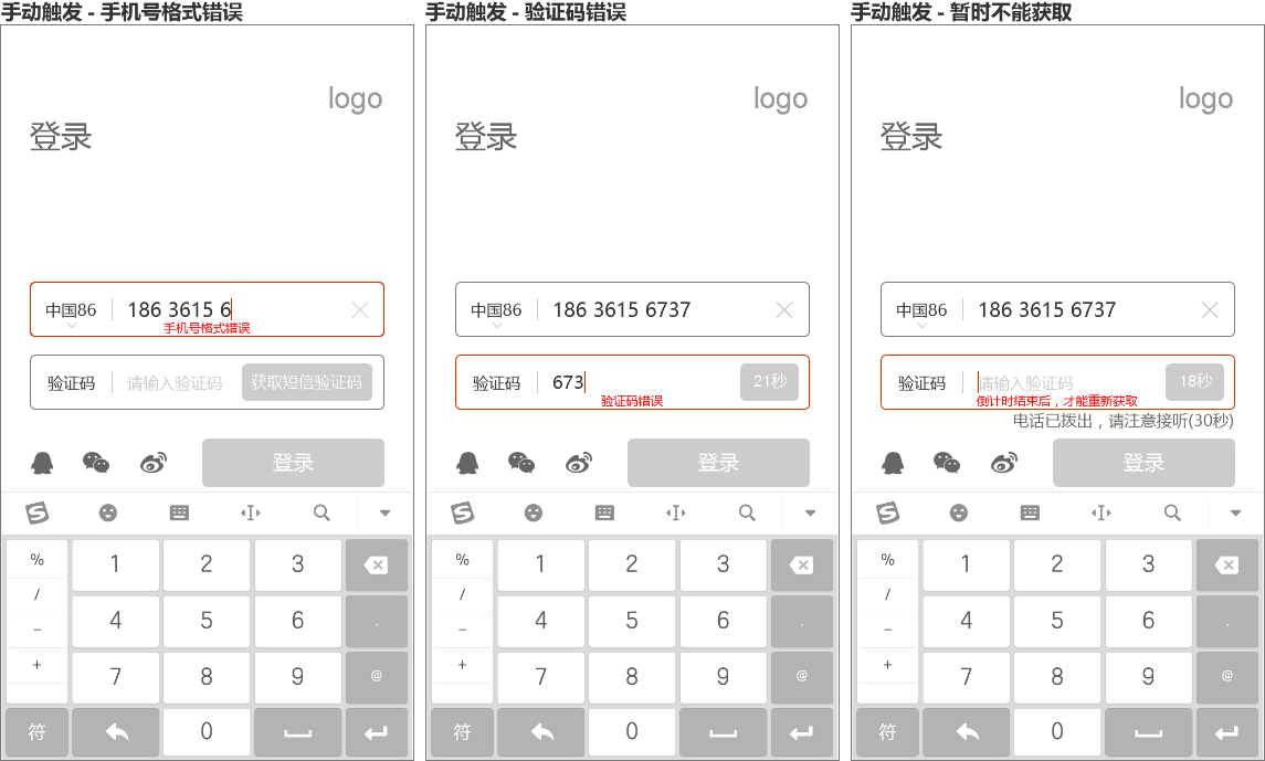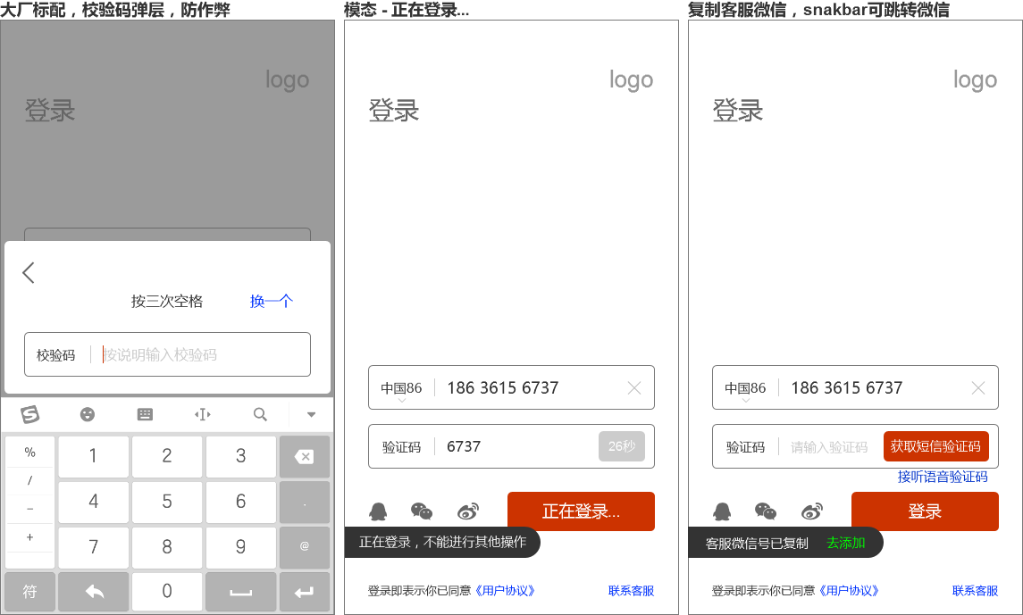 第三方登录无需页面,常见问题:第三方App未安装、App互相拉起权限、返回数据异常等等,只需服务器处理异常即可,这里只说手机号登录: