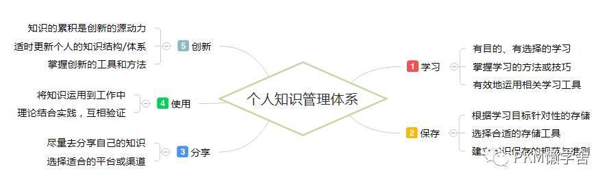 根据知识管理的定义,在《你的知识需要管理》一书中,田志刚老师将个人知识管理体系划分为:学习、保存、分享、使用、创新五个环节,全书围绕这五个环节,从WHY/HOW/工具等进行深度的分析,感兴趣的童鞋可以去看看。