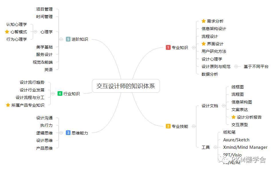 作为一名交互设计师,笔者把交互设计师的专业知识体系分为:专业知识、专业技能、思维能力、行业知识、进阶知识五个部分。